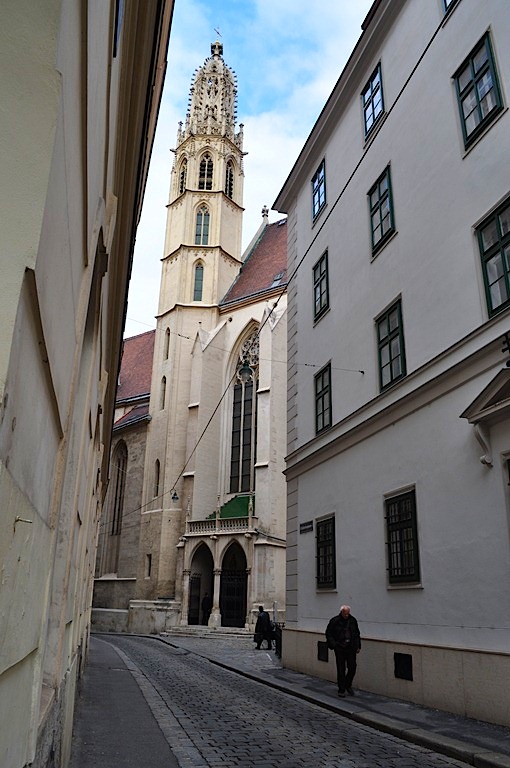 Paradoks wyjazdu do Wiednia polega na tym, że za bilet autobusowy na linii Katowice – Wiedeń zapłaciłem 11 zł w dwie strony, natomiast za bilet kolejowy w jedną stronę z Poznania do Katowic z 50% zniżką – 30 zł. Wyjazd z Poznania godzina 1.32 w nocy (można później, ale zważając na notoryczne kilkugodzinne spóźnienia PKP, wolę nie ryzykować). Kolejna nieprzespana noc przy okazji podróży. O 8 rano wysiadam na dworcu w Katowicach. Autobus mam o 11.20, ale trzeba znaleźć przystanek, a w mieście remont zdezorganizował cały ruch. Zimno. Autobus przyjechał z kilkuminutowym opóźnieniem. Udało się zdobyć miejsce w pierwszym rzędzie na górnym pokładzie, co pozwala na podziwianie widoków przez całą drogę. Do stolicy Austrii docieram o godzinie 20tej z niedużym opóźnieniem. Ruszam do hotelu. Nieprzespana noc sprawia, że trzeba odpocząć. Drugiego dnia z samego rana ruszam zwiedzać. Pierwszym celem jest najstarszy kościół Wiednia zbudowany pod wezwaniem św. Ruperta (fot. obok).