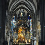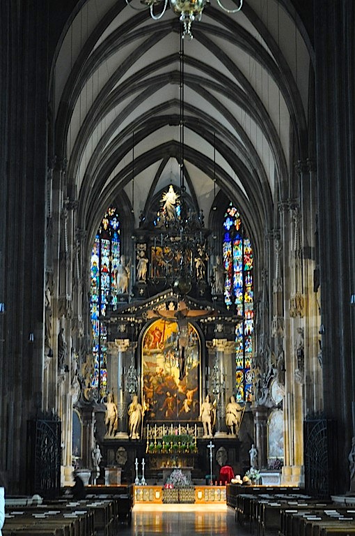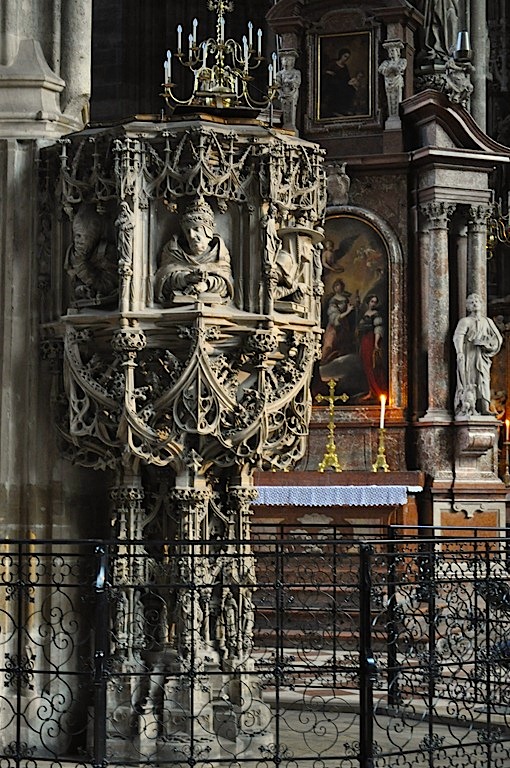 dsc_0228Po obejrzeniu najstarszego placu w mieście ruszam w kierunku katedry św. Stefana, która jest dumą wszystkich Wiedeńczyków. W XII wieku w tym miejscu była bazylika, z której zachowały się Brama Olbrzyma i Heidenturme czyli tzw. Wieże Pogan. Mają one charakter romański. W 1359 roku kościół został przebudowany w stylu gotyckim. Na ołtarzu głównym obejrzeć można ukamienowanie św. Szczepana, w lewej absydzie ołtarz szafowy, który przeniesiony został z Wiener Neustatt, a w prawej absydzie znajduje się grobowiec cesarza Fryderyka III. W południowej nawie wierni oblegają cudowny obraz Matki Boskiej z Pocs. Najciekawszym miejscem jest ambona. Ozdobiono ją wizerunkami ojców Kościoła. Jest ona istotna także z innego powodu. Zbudował ją Anton Pilgram. Artysta przedstawił na niej swoją własną postać (wychylającą się przez okno), odchodząc tym samym od kanonów sztuki średniowiecznej. Duże wyzwanie stanowi wspięcie się na południową wieżę kościoła (wysokość 131 metrów, a do pokonania są 343 schody, koszt 3.5 euro). Druga wieża nie została dokończona, gdyż zabrakło na nią funduszy. Zwieńczono ją złotą kopułą, pod którą umieszczono największy dzwon Austrii (Pummerin) – jeden z 22 w katedrze (można wjechać na wieżę windą za 4.50 euro). W jednej ze świątynnych kaplic znajduje się także cudowna rzeźba ukrzyżowanego Chrystusa, któremu rośnie naturalna broda. Kolejną atrakcją katedry są katakumby (wstęp 4.50 euro), w których umieszczono kości ofiar zarazy. Znajdują się tutaj także wnętrzności Habsburgów (serca spoczywają w kościele Augustianów, a pozostałe szczątki w Kaisergruft), którzy po śmierci życzyli sobie, aby ich rozczłonkować.