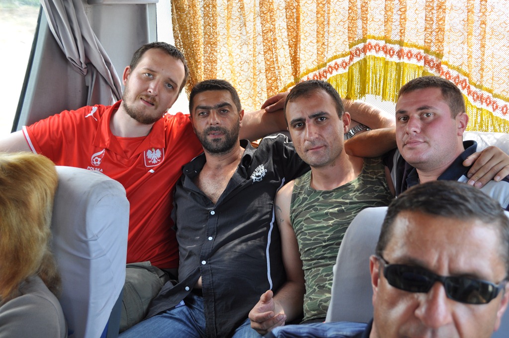 dsc_0022Po czterech dniach pobytu w Armenii ruszam do Turcji. Przejazd nie jest jednak rzeczą łatwą. Autobus jeździe raz w tygodniu. Przy zakupie biletów powiedziano mi, że autobus odjeżdża o godzinie 9tej. Po przeczytaniu informacji na biletach okazało się, że jedzie o godzinie 10tej. Cóż, jestem na przystanku o 8.40, tak na wszelki wypadek. Autobus już czekał. Wsiadłem i czekamy na odjazd. Jak się okazało wyjechaliśmy dopiero o 10.45 :-). Armeńskie poczucie czasu jest nieco inne niż Polskie. Jedziemy. Dość szybko okazało się, że autobus to niezwykle integracyjne miejsce. Ledwo usiadłem na swoim miejscu a współpasażerowie zaczęli pytać czy ,,coś przewożę’. Gdy okazało się, że nie, zaczęli dopytywać czy nie przewiózłbym im przez granicę ,,nieco’’ alkoholu i papierosów. Zgadzam się, i okazuje się, że dzięki tej zgodzie zyskałem sobie bardzo, ale to bardzo wielu przyjaciół. Co zaskakujące, gdy tylko przekroczyliśmy granicę Gruzji (zdjęcie granicy armeńsko-gruzińskiej na zdjęciu obok), poproszono mnie, abym część alkoholu oddał gdyż jak stwierdzili nasi współtowarzysze podróży ,,Można się napić’’. Autobus nie posiadał niestety toalety więc co kilka godzin mieliśmy przystanki ,,za potrzebą’’. Miało to swoje plusy, gdyż po pierwsze pozwalało odpocząć od ,,integrowania się w autobusie przy miejscowym jedzeniu i trunkach’’, a po drugie można było podziwiać widoki. Bardzo szybko się okazało, że im dłużej jedziemy tym bardziej wszyscy chcą z nami rozmawiać i się przyjaźnić. Na każdym przystanku ktoś podchodził i zagadywał. Zresztą kilka zdjęć to pokazuje.