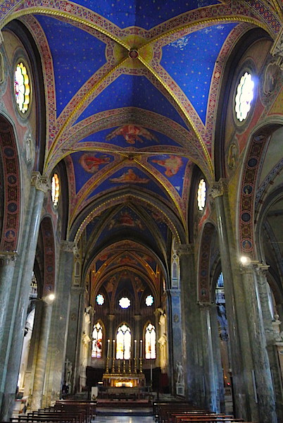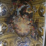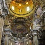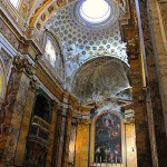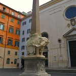 Wracamy na południowy-wschód od Panteonu, znów przedzierając się przez tłumy jakie wokół niego się gromadzą i odnajdujemy jeden z niewielu gotyckich kościołów jakie zachowały się w stolicy Włoch a jest nim Santa Maria Sopra Minerva. Przed nim dostrzeżemy słonia z egipskim obeliskiem na grzbiecie – rzeźba pochodzi z XVII wieku. Został kościół ten zbudowany w roku 1280. Nowa budowla zastąpiła starszą z VI wieku po Chrystusie. Świątynia skrywa grobowce kilku papieży oraz zmarłej w roku 1380 patronki Włoch, św. Katarzyny ze Sieny. Całość wieńczą prace Michała Anioła. W kościele odnaleźliśmy także grobowce aż trzech Polaków. Pierwszym był biskup przemyski Antonii Józef Wałygina Monastyrski, drugim Witold Bronisław Stablewski a trzecim Jóżef Korwin-Szymanowski. Ten ostatni był generałem w czasie powstania listopadowego. Wychodzimy ze świątyni i skręcamy w ulicę Via del Pie’di Marmo. Dochodzimy do siedemnastowiecznego kościoła św. Ignacego Loyoli. Zbudowano go na cześć założyciela zakonu jezuitów. Najważniejszym dziełem sztuki w tym kościele jest malowidło iluzjonistyczne Andrei Pozziego na suficie, które przedstawia sklepienie niebieskie.