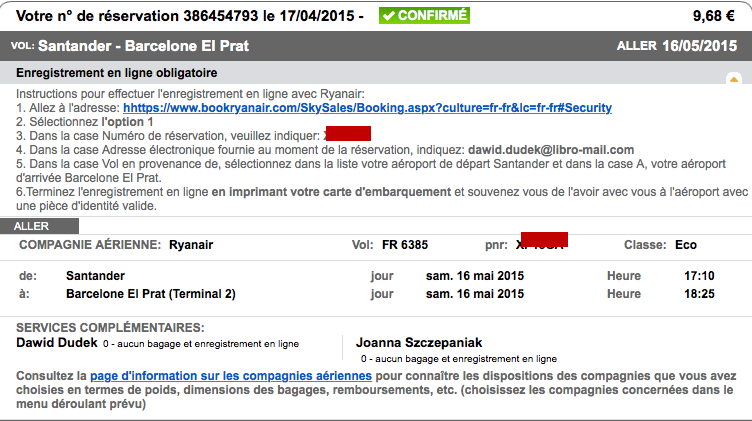 Noc była krótka. Zasnęliśmy przed północą (ech to pakowanie się), a autobus na lotnisko Stansted mieliśmy zakupiony na 4.15 rano. Kochany EasyBus pozwolił za parę groszy dojechać dwóm osobom. Nasz hotel leży jakieś 500 metrów od przystanku autobusu nocnego. Wychodzimy o 3.30, łapiemy autobus. Przemierzamy, siedząc na górze, nocny Londyn, by po kilkunastu minutach wysiąść niedaleko przystanku EasyBusa, skąd odjedziemy na lotnisko. Odnalezienie przystanku nie jest rzeczą najprostszą – na szczęście mamy GPS i dzięki uprzejmości kierowcy busik nie o 4.15, ale o 4.00 zabiera nas na lotnisko. Gdy na nie docieramy, już świta… Szybki załadunek do samolotu i lecimy do Hiszpanii. Bilety kosztowały nas 6.96 euro za dwie osoby (cena normalna w naszym terminie wynosiła ponad 50 euro za 2 osoby!) – zrzut ekranu poniżej. Znów Biblia Taniego Latania pozwoliła zaoszczędzić i to bardzo dużo!
