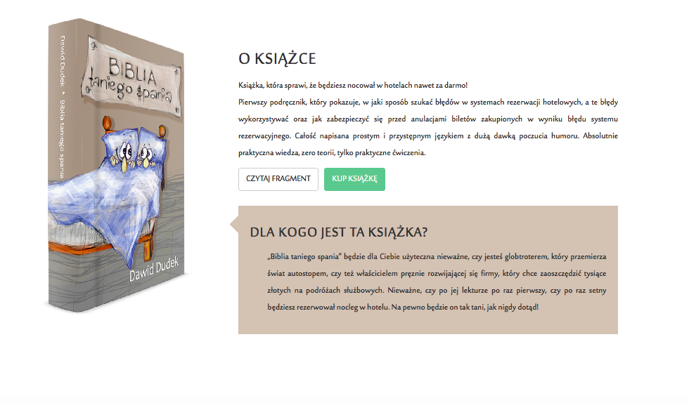 W natłoku podróży, planowania i dziesiątek innych rzeczy, którymi zajmuję się na co dzień, niemal zaniedbałem bloga. Ukazała się moja nowa książka — „Biblia taniego spania”. Ponad 300 stron praktycznej wiedzy o tym jak znaleźć ekstremalnie tani, a nawet darmowy nocleg. Osobne rozdziały zostały poświęcone temu, w jaki sposób zabezpieczyć się przed anulacjami rezerwacji „po błędzie” — ot takiej jak np. opisana na moim blogu jakiś czas temu. Książka dostępna jest w naszej księgarni. Wysyłamy ekspresem na cały świat. Jeśli chcesz nauczyć się jak nie tylko nie przepłacać za noclegi, ale nocować naprawdę za grosze, powinna to być dla Ciebie lektura obowiązkowa.
