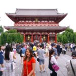 Upał sprawia, że na zwiedzanie poświęcamy prawie 2 godziny. Siadamy na obiad – tak oryginalnie – sushi- i kierujemy się do Sensoji. Buddyści zbudowali ją w 628 roku – jest największą i najpopularniejszą świątynią w Japonii. Według legendy dwóch rybaków wyłowiło w pobliżu rzeki Sumidy posąg bogini Kannon i dla niej właśnie zbudowano świątynię. Odwiedza ją około 30 milionów turystów rocznie – tłumy na każdym kroku. Po przejściu (a raczej przebiciu się przez ocean ludzi) podchodzimy do słynnej Bramy Pioruna. Ogromne czerwone lampiony i dwa potężne posągi: boga wiatru i boga pioruna stoją na jej straży. Przechodzimy przez bramę i kierujemy się do głównego budynku świątyni, gdzie czci się boginię Kannon. Pomiędzy bramami znajduje się wąska ulica pełna sklepów i straganów – Nakamise-dori. Jest to najdłuższa tego typu ulica handlowa w Japonii. Po przejściu przez drugą bramę oglądamy najstarszy obiekt w świątyni – pochodzący z XVI wieku pawilon Buddy Yakushi.