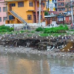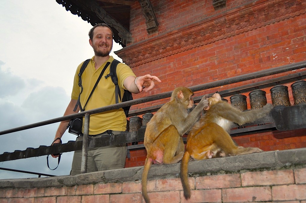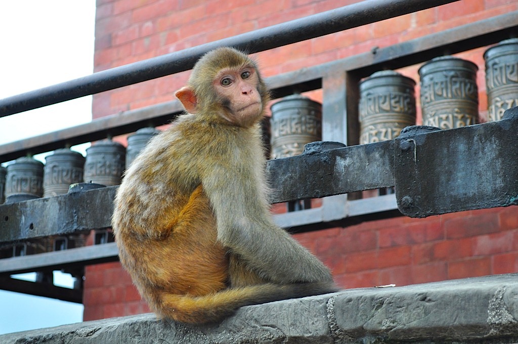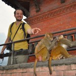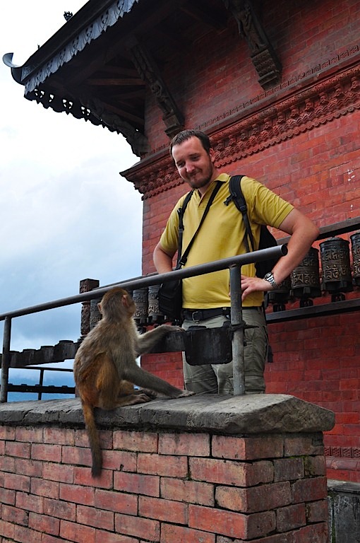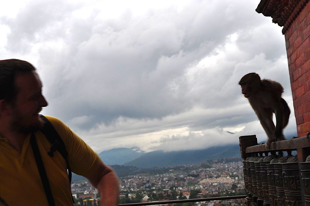 Po wizycie na placu Durbar kroki kieruję do tzw. Świątyni Małp. Nazwa jak najbardziej odpowiednia, bo tych stworzeń żyje tam bardzo wiele. Co istotne ze szczytu rozciąga się widok na znakomitą większość Katmandu a przy dobrej pogodzie widać szczyty górskie otaczające dolinę…Aby tam dojść jednak trzeba po pierwsze przejść przez niezbyt czyste miasto, swoistą mieszankę śmietnika oraz targowiska, w proporcjach 50/50%. Zresztą sami zobaczcie.
