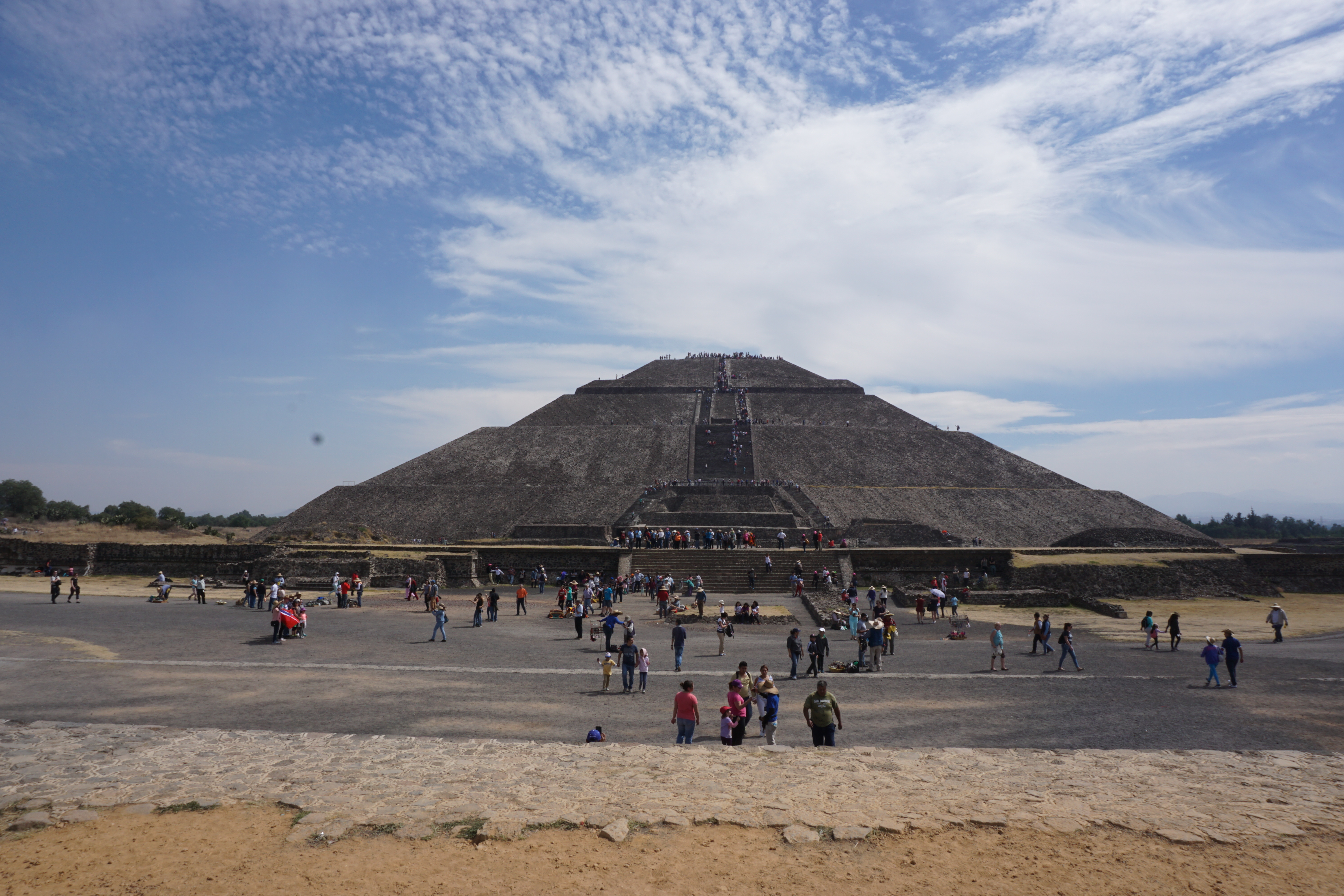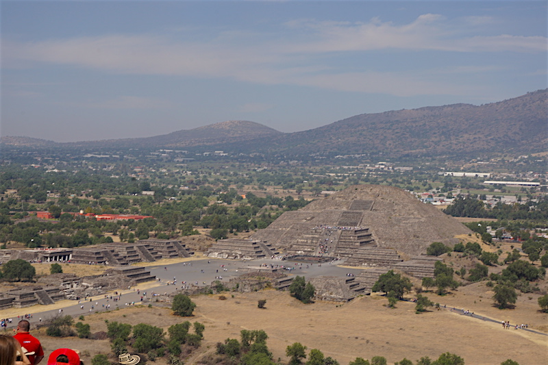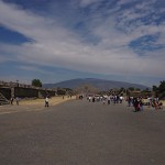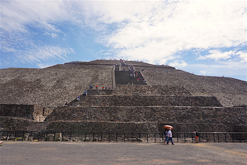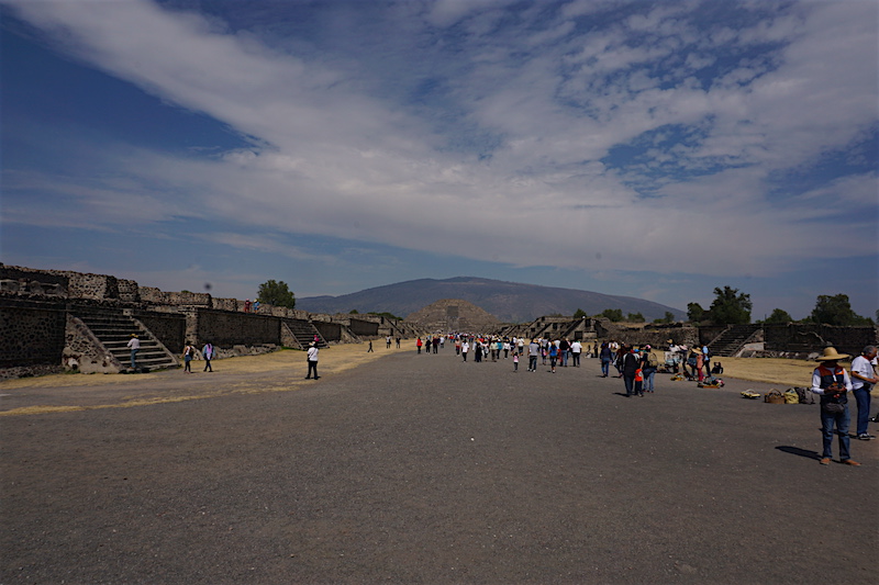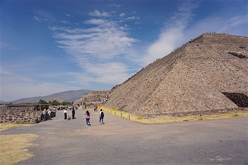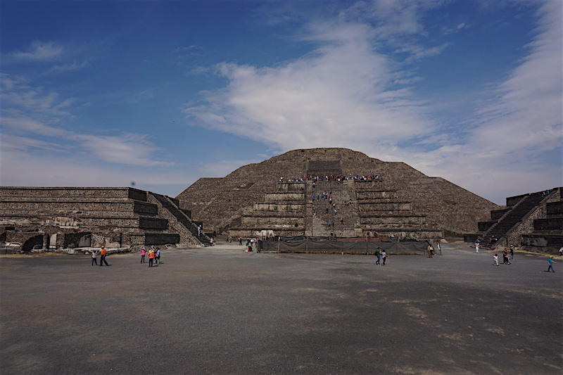 Wchodzimy na teren kompleksu nieco przytłoczeni, nie tyle piramidami, co tłumem ludzi. Skoro jednak o zabytkach mowa. Największe dwie atrakcje, jakie tutaj się znajdują, to Piramida Słońca oraz Piramida Księżyca. Co jednak zabawne, większość turystów spaceruje po najbardziej niezwykłym z zabytków i nawet tego nie zauważa. Zabytkiem tym jest szeroka na 40 metrów i długa na ponad 2 kilometry (!!!) Aleja Zmarłych. Ciągnie się ona od Piramidy Księżyca (od tego miejsca zalecam zwiedzanie, mimo że kusi tak ogromem, jak i mrowiem ludzi, aby wejść najpierw na Piramidę Słońca) do Cytadeli. Wzdłuż niej usytuowano wiele świątyń oraz Piramidę Słońca. Budowle wzniesione na terenie Teotihuacanu powstały bez użycia metalowych narzędzi. Dwie piramidy: Piramida Słońca o długości podstawy 225,0 m × 207,0 m i wysokość 65,0 m oraz Piramida Księżyca (150,0 × 120,0 × 43,0 m) to najstarsze budowle tego kompleksu. Konstrukcje schodkowych piramid w stylu talud-tablero zbudowane są z kolejnych tarasów stawianych na skarpach. Do budowy użyto wysuszonych na słońcu cegieł adobe i ziemi, po ukształtowaniu budowli obłożono jej ściany płytami kamiennymi. Połączone płaszczyzny skośne i poziome ozdobione są rzeźbami. Na najwyższym tarasie zbudowano świątynię, z której zachowały się tylko ruiny. Do piramidy prowadzą strome i wysokie stopnie. U podnóża budowli zachowały się ruiny pomieszczeń kapłańskich. Taki sposób budowania i zdobienia piramid został przyjęty przez inne plemiona Mezoameryki. W 1971 roku podczas prowadzonych prac badawczych, odkryto pod Piramidą Słońca tunel i komory. Rozbudziło to wyobraźnię wszelkiej maści łowców skarbów, którzy niemal masowo próbowali tutaj prowadzić nielegalne wykopaliska.